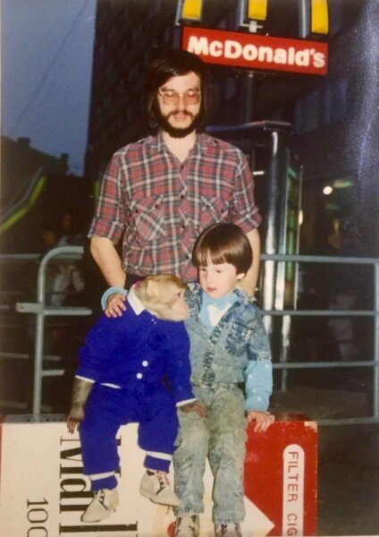 На фотографии как раз тот год: мой муж, сын и работающая моделью мартышка на фоне очередей в Макдональдс. Место в очереди продавали ушлые молодые люди. Дикий капитализм надвигался на страну. Именно в тот год рухнула Берлинская стена и вышел Закон СССР «О печати и других средствах массовой информации», который запретил цензуру.