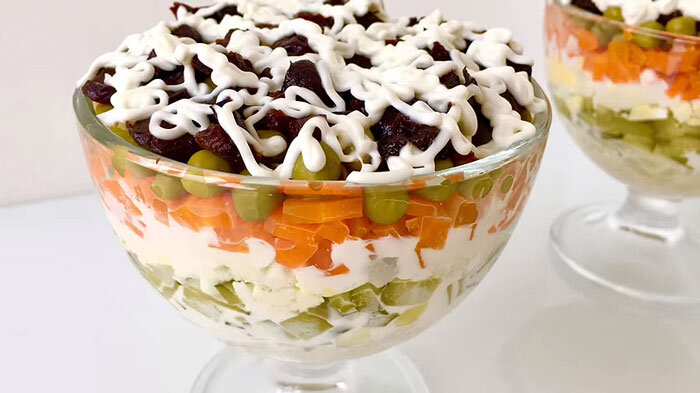 - Чтобы салат не получился сухим, не забудьте про майонезную прослойку.