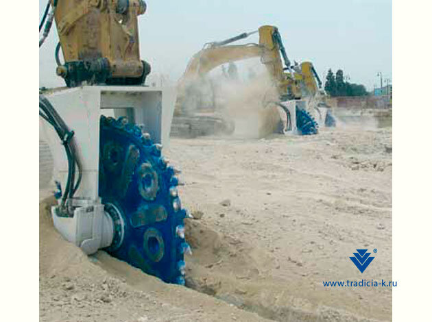 Владельцы карьеров не понаслышке знают, как дорого и сложно проводить буровзрывные работы. К счастью, прогресс не стоит на месте, и появляются новые методы добычи горных пород. Один из таких методов предлагает Компания «Традиция-К». Инновационная технология подходит для открытых разработок. Она основана на методе холодного фрезерования и реализуется в два этапа с помощью дисковой фрезы и клыка-рыхлителя. В ходе испытаний оборудования, проводившихся в течение года в Европе и на Ближнем Востоке, были достигнуты высокие показатели по производительности, а конструкция клыка-рыхлителя прошла многоэтапную доработку. Каков же принцип технологии холодного фрезерования? Дисковая фреза нарезает слоты в высоту забоя глубиной до 1 м и толщиной 150 мм. Расстояние между слотами может колебаться от 300 до 2000 мм. Затем в слот вставляется специальный клык с шириной между резцами 180 мм. Подрезая материал «сзади», клык расклинивает его и выталкивает вперед. В каких случаях стоит рассма