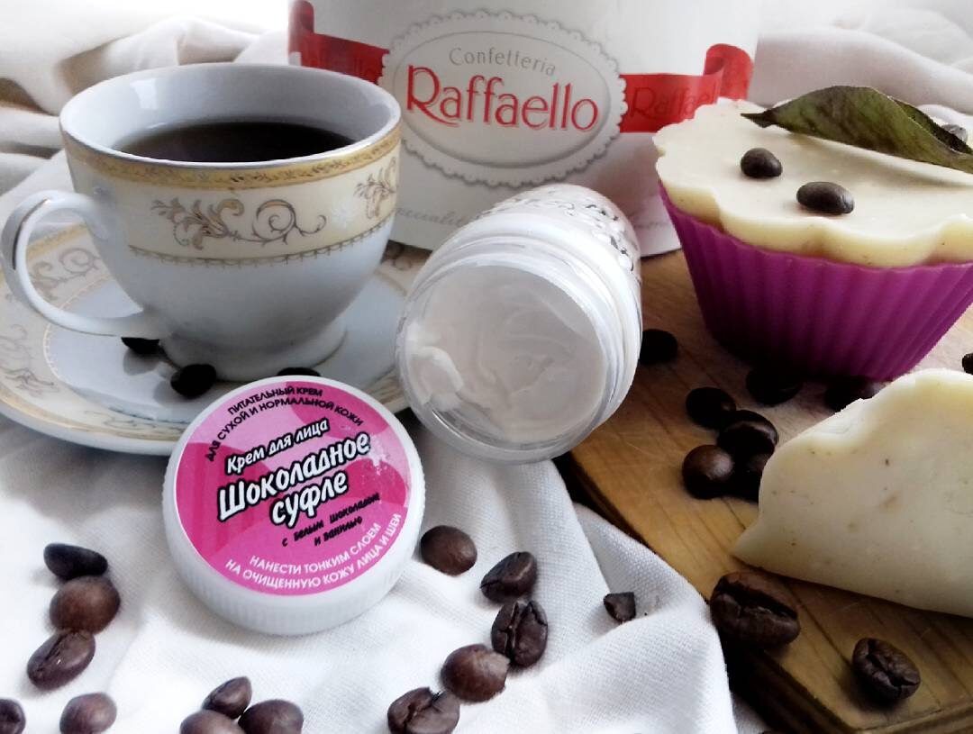 Крем для лица "Шоколадное суфле" Meela Meelo определенно один из самых вкусных моих кремов.Хотя это и не удивительно - белый шоколад здесь на втором месте в составе))) Характеристи и состав с оф.сайта: С натуральным белым шоколадом и ванилью. Питательный крем для сухой и нормальной кожи. Способ применения: нанести крем тонким слоем на очищенную кожу лица и шеи, избегая области вокруг глаз. Подождать полного впитывания, при необходимости промокнуть салфеткой. Крем очень эффективно питает кожу, рекомендуем регулярно наносить его на ночь, или днем, для защиты кожи в холодное время года. Состав: питьевая вода, натуральный белый шоколад, натуральный цветочный глицерин, натуральное масло рисовых отрубей, натуральный растительный эмульгатор, витамин Е, натуральное масло бурбонской ванили, феноксиэтанол из растительного сырья, натуральное эфирное масло горького миндаля. Консистенция у крема густая и плотная,но по лицу распредяется легко,он будто тает на коже и расходуется очень экономично
