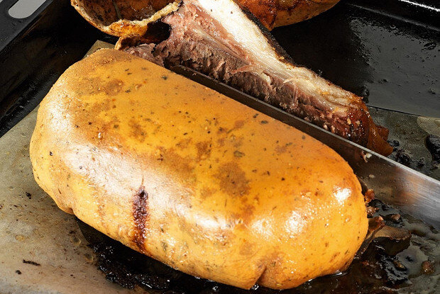3. Раскатать тесто, выложить на него седло, укрыть тестом, перевернуть и выложить на противень, выстланный пекарской бумагой. Запекать час или чуть больше при температуре 170 градусов. Можно время от времени поливать корочку из теста тем жиром, который будет вытекать по мере приготовления.