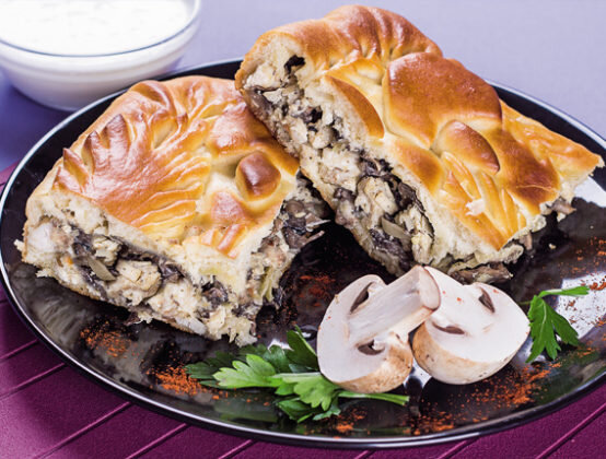 - Раскатать (прямо на противне) две продолговатые лепешки, положить фарш, выровнять его в виде овалов и тщательно защипнуть края. Вырезать из тонко раскатанного теста ножом веточки или другие фигуры, украсить ими кулебяку и тоже смазать желтком. Сделать несколько проколов по бокам и сверху (чтобы выходил из кулебяк при выпечке выходил пар).