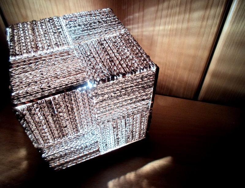 Сегодня мы хотим вам рассказать о том, как можно сделать очень красивый светильник из ничего. Ну, почти. Что нам понадобится Вырезаем полоски Нам нужно вырезать большее количество полосок из картона. Каждая должна иметь размеры 0.5 x 8 см. Всего 320 штук. Соединяем полоски Самая сложная часть работы позади. Собираем из полосок квадраты указанным способом. Нужно 20 квадратов. Полоски склеиваем клеем ПВА. Из маленьких квадратов делаем большие Теперь из четырех квадратов делаем один большой. Всего надо сделать пять таких. Соединяем квадраты Мы должны сделать из полученных квадратов куб, в котором нет одной грани. Клеим тем же клеем ПВА. Делаем основание Теперь делаем маленькую коробочку, следуя инструкции на картинках. Доделываем его Пластырь будет нашим "замком". Делаем дырку для лампы Осталось немного. Сперва делаем дырку для нашей лампы. Закрываем конструкцию нашей крышкой Четыре подобных треугольника помогу удержать крышку. Наслаждаемся результатом Выключаем свет. Включаем ламп