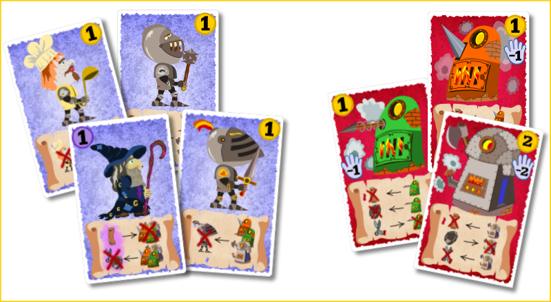 А в чем же сакральный смысл игры, спросите вы? Король Кибертании дает золото только за Трофеи, который ему приносят Рыцари (не вы, милорд) и за выведенных из строя Пароботов, поэтому ваша задача состоит в сохранении команды, победы над большим числом Пароботов и получением дополнительных бонусов. За Пароботов, которые увязались за вами (остались у вас в руке) или за не разыгранные спецкарты вас наоборот штрафуют, а за Рыцарей, представшим перед королем со «своим» оружием, наоборот премируют.