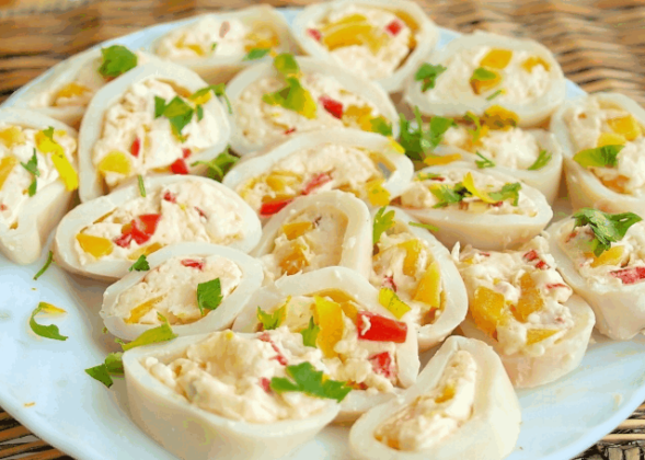 - Сладкий перец вымыть, удалить сердцевину с семенами и мелко нарезать. Плавленый сыр размять вилкой. Чеснок пропустить через пресс, смешать с перцем и плавленым сыром, посолить и поперчить. Тушки кальмаров наполнить начинкой и положить в холодильник на 30 минут.