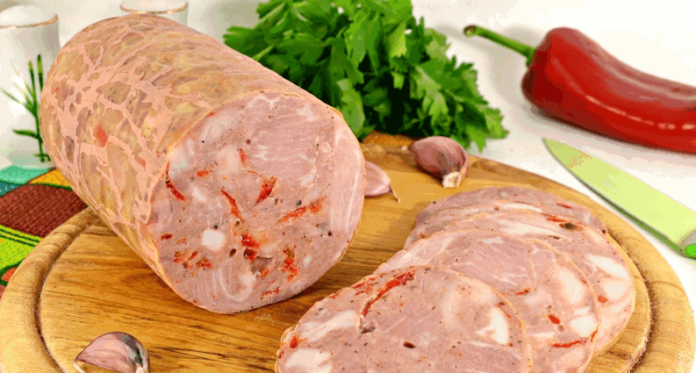- Завязать один конец и набить оболочку при помощи мясорубки со специальной насадкой или колбасного шприца. Набиваем плотно, стараясь, чтобы не попал воздух. Если есть пузырьки, то это место проткнуть иголочкой. Но проколов должно быть минимум.