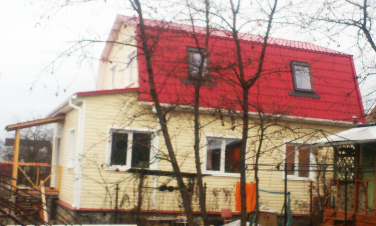 Вот так выглядит каркасно-щитовой дом почти в готовом виде. По крайней мере в нем уже можно жить. Кровля из металлочерепицы смонтирована. Конструкция дома больше не промокает. Удалось построить дом в сухой период и ни одна капля воды не попала внутрь! Евро-окна установлены. Причем были выбраны стекла-хамелеоны, которые в жаркие дни пропускают в дом меньше тепла, а в холодные - больше.