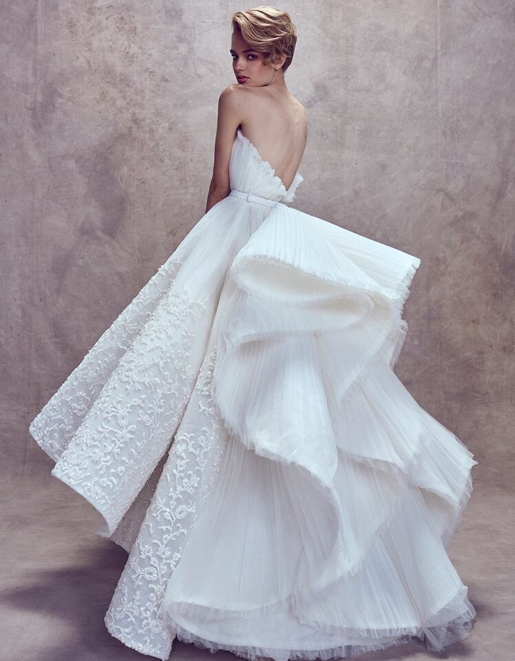 Каждая коллекция Ashi Studio — восторг! Дизайнер Мохаммед Аши (Mohammed Ashi) создал нежную коллекцию ангельских платьев. Не экспериментируя с оттенками платьев для невесты, автор играет формами и текстурой. Такой крой — авторская фишка, которая выделяет Ashi Studio в линейке свадебной моды. Королевский крой юбок, пышные воланы, волны, рюши — все это выглядит органично и шикарно. Даже при пошиве свадебных платьев, дизайнер не отступает от свой линии «чувственной аристократичности» в сочетании с современными технологиями. Ручная вышивка, цветы, жемчуг, открытая спинка, приспущенные плечи — гармонично сочетаются в новой коллекции. Предлагаю полюбоваться новинками.