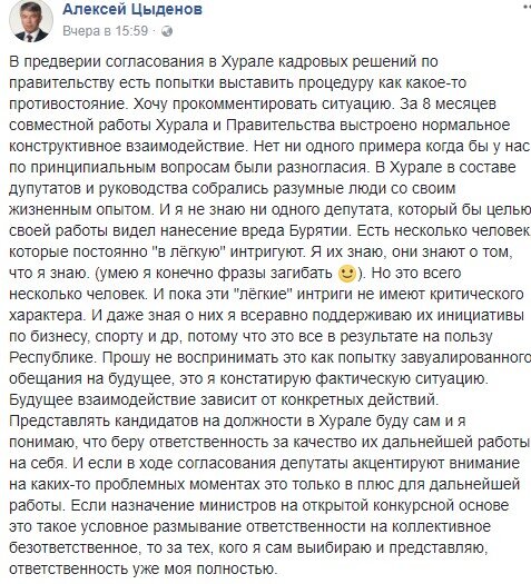 В Бурятии нарастает напряжение перед внеочередной сессией Народного Хурала 10 октября. На ней депутаты Народного Хурала будут утверждать новых зампредов правительства. Ранее в парламенте ставленникам Алексея Цыденова «задали жару» - народные избранники цинично и дерзко раскритиковали министров и зампредов, отклонившись от обсуждаемой темы бюджета и едва не переходя на личности. Дело дошло до того, что сторонам конфликта пришлось публично выступить с попыткой хоть как-то разрядить атмосферу. Насколько хорошо у них это вышло – оставляем на суд читателей Бабра. Глава Бурятии Алексей Цыденов обратился к жителям Бурятии в фейсбуке. Он настаивает, что между парламентом и правительством «выстроено нормальное конструктивное взаимодействие», и принципиальных разногласий между ними нет. Отметим, что относительно оперативная реакция главы на прецедент – похвальна, как и публичность Алексея Цыденова в целом. Впрочем, он не стал скрывать, что интриганы в Хурале есть, и отношения правительства с п