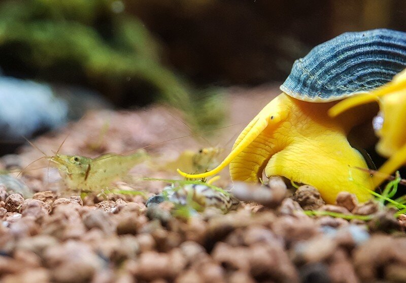 Гигантская оранжевая улитка Кролик из Сулавеси ( Tylomelania sp. ) - одна из самых редких улиток в аквариумистике. Они также известны как Слоновьи улитки, их естественная среда обитания находится в Индонезии, и их иногда встречают в Соединенных Штатах. Название «Кролик», вероятно, происходит от их кроликоподобных лиц и свисающих антенн, которые напоминают уши кролика. Однако сходство тиломелании со слоном также сразу видно по их морщинистой, резиновой коже и длинными мордочками. Излишне говорить, что эти улитки, безусловно, уникальны по своему внешнему виду! Улитки Кролики обычно имеют тела с ярко желтой или оранжевой окраской (хотя есть виды с зеленой, черной, шоколадной, белой и пятнистой окраской), а их раковины черные или очень темно-коричневые, а иногда имеют белую кайму. Их раковины вытянуты в длину и имеют спиральную форму и сужаются к точке в конце, что делает их оболочку напоминающей рог единорога по форме. Эти улитки достаточно любопытны по своей природе, и каждая улитка исп