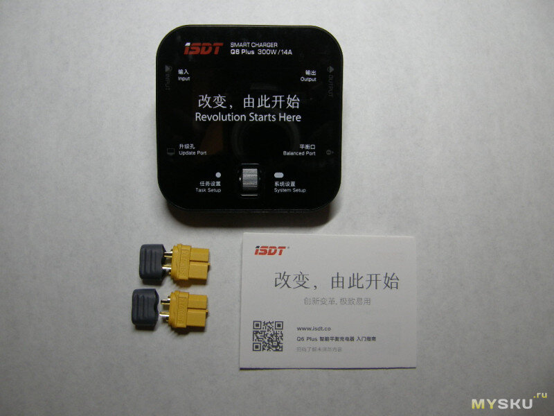 В коробке кроме самой зарядки инструкция и два штекера XT60. Явно подразумевается, что моделист сам спаяет необходимые ему кабели.