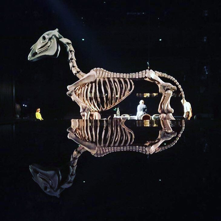 О сценографии мы сначала писать не хотели, но пришлось — умолчать об этих успехах нельзя. А это именно, что успех — куски пепла, которые шуршали под ногами актёров весь спектакль. О символическом значении такой декорации предлагаем вам поразмыслить самим (или дождаться рецензии), скажем лишь, что шёпот пепла в безмолвных сценах, на наш взгляд — лучший саундтрек (снова о блестящих звуквых решениях) к «Господам Головлёвым», который можно было придумать. Ну и, конечно, монструозный скелет коня на колёсиках, заставляющий вспомнить поговорку: «Лошадь сдохла — слезь!» Но как раз этого и не могут сделать господа Головлёвы, до самого конца таскающие за собой эти обглоданные кости.