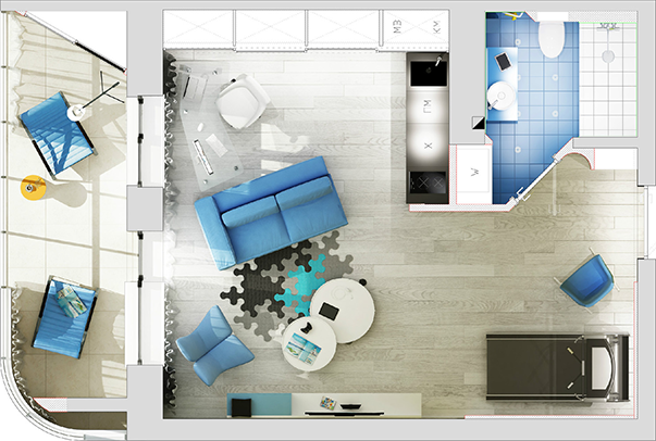 Яркий атмосферный интерьер по мотивам фантастического анимационного сериала «Adventure Time with Finn & Jake». Автор проекта Денис Воронков использует минимум мебели и всего три основных цвета: белый, голубой и желтый. Мебель суперсовременной формы, коврик-паззл и скрытая кухня создают ощущение, что это не реальная квартира, а 3D-анимация. Сведения о квартире: небольшая квартира-студия О владельцах: активная позитивная дама Пожелания клиентов: яркий позитивный интерьер Хозяйка мини квартиры выразила дизайнеру Денису Воронкову пожелание , чтобы интерьер был столь же ярким, как она сама. Вместе они решили, что позитивную энергетику лучше всего смогут передать мотивы анимационного сериала «Adventure Time with Finn & Jake» («Время приключений»). Не многие красивые малогабаритные квартиры выполнены в таком стиле! Кроме общего настроения, из мультфильма в реальность перекочевали чистые контрастные цвета и необычная геометрия. Персонажи фильма, мальчик Финн и его пес Джейк, присутствуют