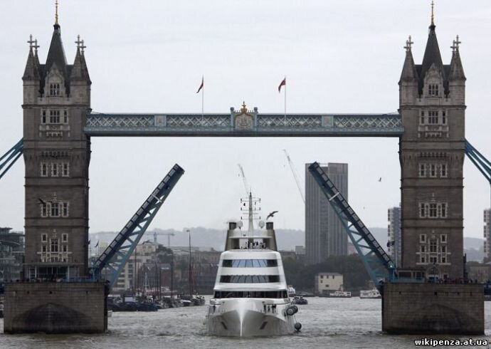 В то время как состоятельные арабы разъезжают по Лондону на дорогих суперкарах, русский олигарх использует здесь в качестве транспорта роскошную яхту. Настоящим событием для жителей Лондона стал проход яхты российского миллиардера Андрея Мельниченко под Тауэрским мостом в минувшие выходные. Несмотря на дождливый день, на набережной Темзы собралось большое количество людей, которые хотели взглянуть на одну из самых больших и роскошных яхт в мире. Судно под названием «А» имеет длину 119 метров и оценивается более чем в 300 миллионов долларов. Яхта рассчитана на 14 пассажиров, при этом ее экипаж состоит из 37 человек. На борту есть вертолетная площадка, три бассейна, джакузи в каждой гостевой каюте и несколько больших залов для отдыха.