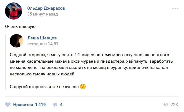 А в случае Эльдара Джарахова можно было бы добавить не только тараканов, но и бельгийских бурых, лобковые волосы и стрельбу пейнтбольными шарами по яйцам оппонента. «Селфи» выступает за качественный контент на Ютубе.
