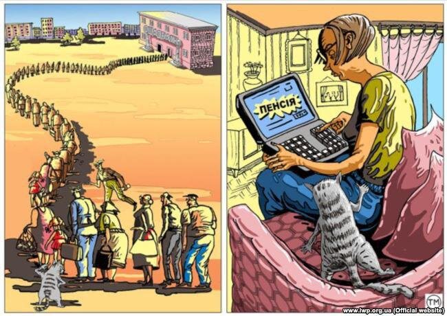 Вот гигантская очередь змеится в собес на горизонте. Это Украина. А вот старушка с котиком только что получила пенсию прямо на ноут. Это Европа. Вот огромный начальник орет на крошку-подчиненного. Это Украина. А вот добрый начальник помогает подчиненному трудиться добрым советом и чашкой кофе, лишь слегка превосходя его в размерах. Это Европа. Вот плешивого дядю с подарочным фикусом и почетной грамотой провожают на пенсию — на дачу за покосившимся забором. Это Украина. А вот того же дядю, но в пробковом шлеме колонизатора, провожают к туристическому агентству. Это Европа. Вот старушка плачет над усопшим в 68 лет мужем. Это Украина. А вот старичок и старушка, оба за 70, лежат на пляже под зонтиком — это Европа. Вот украинец в заштопанных портках выходит из вип-иномарки. А вот европейский король в мантии слезает со своего велосипеда. Вот украинец считает жалкую свою получку. А вот европеец в бабочке мчит чем-то наслаждаться на огромную свою зарплату.