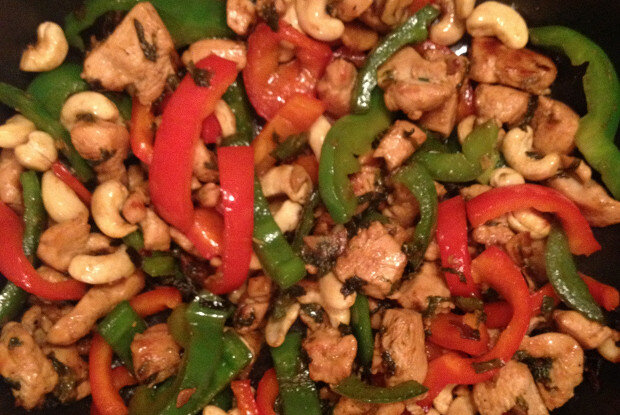 12. Лук репчатый - 3 г Инструкция приготовления 1. 2 половинки грудки предварительно замариновать в оливковом масле, соевом соусе и чесноке от 1 часа до 5 часов (хотя можно и дольше). 2. Грудку нарезать полосками и обжарить до золотистой корочки на сковороде с растительным маслом. Добавить соевый соус. 3. Зеленый лук порубить. Головки обычного лука выбрать поменьше и порезать сначала по экватору и затем каждую половинку на 4 части. Зубчики чеснока порезать на дольки. Чили мелко-мелко порубить. 4. Добавить кешью, чеснок и перец чили. Добавить кунжутное масло, все тщательно перемешать и обжаривать еще 5 минут.