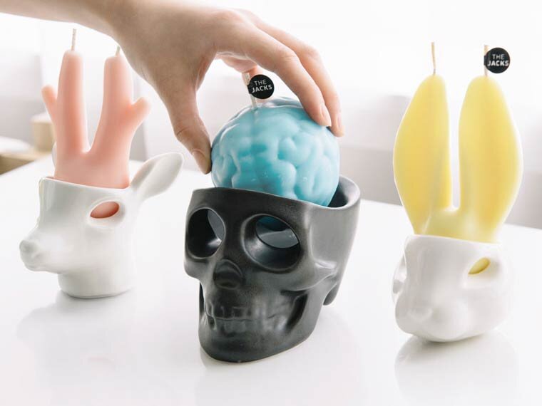 Jacks - это целая коллекция ароматных свечей в форме черепов и животных. Ключевым моментом является то, что стекающий воск при горении свечи, будет создавать эффект слез.