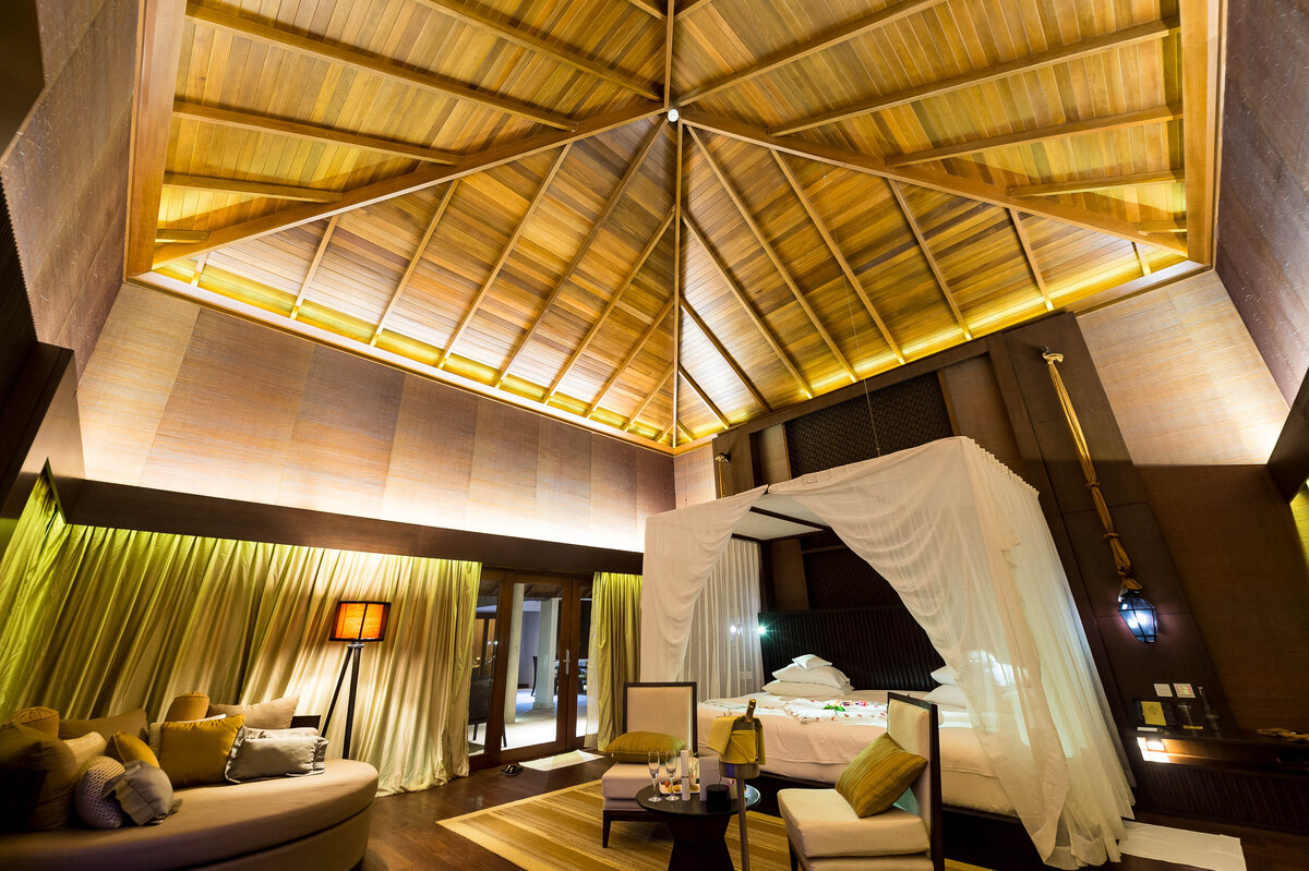 Персональный пляж, гигантская кровать, личный бассейн, гостевой домик, огромная ванная — это лишь часть того, что будет в вашем распоряжении, если вы остановитесь на этом райском острове. Огромная входная дверь виллы сразу намекает на масштаб того, что окажется внутри. А там большой бассейн, уличная кровать, на которой можно встретить закат и дорожка, ведущая на собственный пляж. Идешь туда, а там никого. Виллы находятся так далеко друг от друга, что даже если соседи начнут кричать, вы их не услышите, и ощущение полной приватности не покинет вас. Рано утром песок перед виллой каким-то волшебным образом выравнивают. На нем лишь наши следы: Тропинка к уличному душу. Механика следующая: искупался в море, постоял под душем, пошел купаться в бассейне… Как выглядит вилла вечером, мне нравится намного больше. Поэтому все самые интересные фотографии я сделал вечером, в день приезда. В левой части кадра гостевой домик или гостиная комната, кому как больше нравится. Мы там были лишь раз, ког