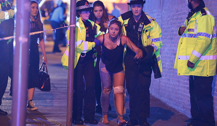 Пострадавшим участникам концерта помогают полицейские и экстренные службы в Манчестер-Арене после сообщений о взрыве, Манчестер, Англия.