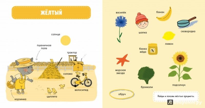 Отличная книжка для изучения цветов с вашим малышом от Агнес Бессон "Главная книга малыша. Цвета и предметы". 24 страницы красочных, сочных и ярких иллюстраций. Через пару месяцев прочтения этой книги и обучения по ней, ваш малыш должен ответить на такие вопросы, какого цвета шапка или банан, брокколи. Помимо цвета малыш еще изучает предметы. С помощью этой книжки ваш малыш разовьет пространственное мышление, внимание, речь и память, а также повысит свою любознательность. Моему ребенку в 1.2 годика книжка очень нравится, листает в течения дня, а я рассказываю, что нарисовано и какого это цвета. Книжка стоит своих денег. В Лабиринте я ее купила за 240 рублей! Размеры ее кстати 186x175x8 мм, если для кого-то это важно. Покупайте, не пожалеете!