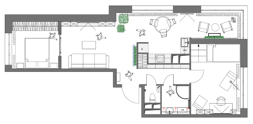 Интерьеры перепланированной квартиры были разработаны максимально функциональными и удобными, согласно привычкам и пожеланиям заказчиков, с минимальным количеством компактной корпусной мебели. При первой же встрече стало понятно, что у заказчицы отличный вкус. Её предложение сделать интерьер квартиры в серых, зелёных и болотных тонах было принято.