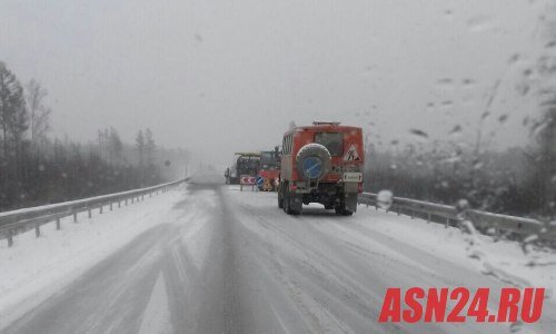В редакцию АСН24 прислали снимки дорожных работ, проводимых во время непогоды. Читательница заметила между поселком Невер и городом Сковородино рабочих, кладущих асфальт в снег.