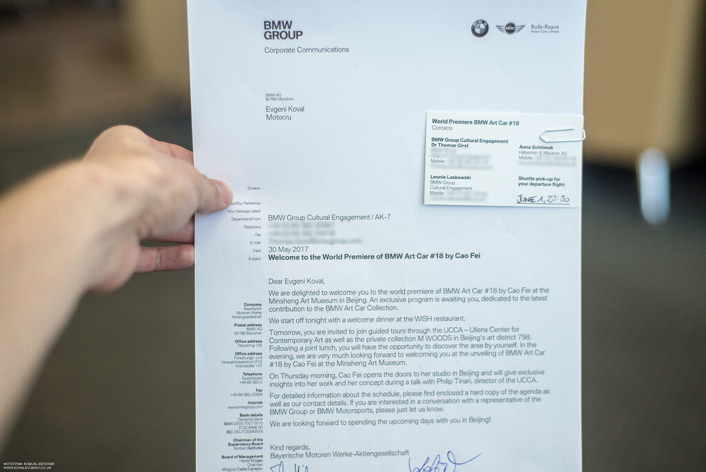 Как это было. Внезапный звонок в два часа ночи субботы (типично для москвичей). Мне сообщают что БМВ приглашает на презентацию нового арт-кара в Пекине. Уже 29 апреля у меня была готова виза и имелись билеты на руках. Встречают и отвозят на БМВ представительского класса, любят и целуют, селят в пятизвёздночную гостиницу на самой дорогой улице Пекина — Саньлитунь.