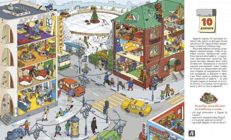 Сегодня пойдет речь о волшебной детской книге "30 дней до Нового года" Разаковой Варвары. Если вы хотите рассказать малышу, что такое Новый год и как к нему готовятся люди - эта книга для вас! 22 страницы панорамных картинок новогодней суеты расскажут малышу как один перекресток в разрезе с двумя домами меняются с каждым 5м днем при наступлении Нового Года. Детишкам около 2х лет очень интересно разглядывать изменения: Через 5 дней: Книга "30 дней до Нового года" хорошо тренирует внимание, развивает логическое мышление и память. Стоит правда эта книга в районе 500 рублей, не дешевое удовольствие, но оно того стоит! Подарите своему малышу новогоднее волшебство и настроение!