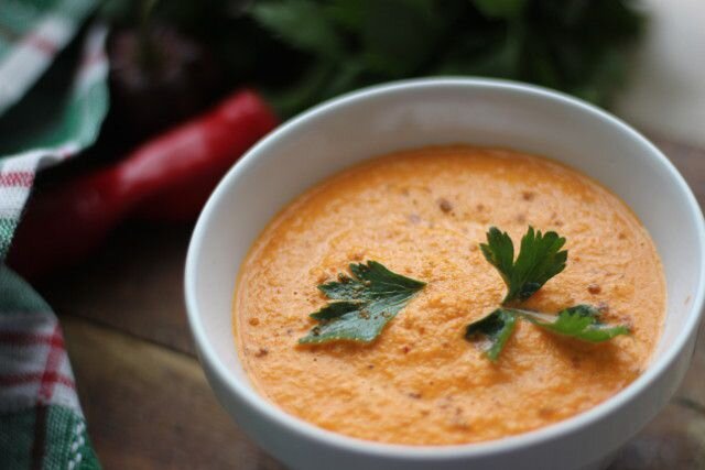 Пропустите через соковыжималку или измельчите с помощью мощного блендера 200 граммов мякоти тыквы, 50 граммов сладкого перца красного или оранжевого окраса, 1 дольку чеснока, кусочек корня имбиря примерно 1 - 1,5 см длиной, по вкусу свежий острый перец. Все перечисленные компоненты должны быть предварительно тщательно вымыты и очищены. Сок вместе с мякотью перелейте в узкую высокую емкость. Добавьте 3 столовые ложки семян кунжута или очищенных тыквенных семечек, размолов их в кофемолке. Положите пару щепоток морской соли, влейте 100 мл холодной воды, 3 столовые ложки растительного масла/ Теперь все вместе взбейте блендером, разлейте по тарелкам и посыпьте измельченной зеленью.