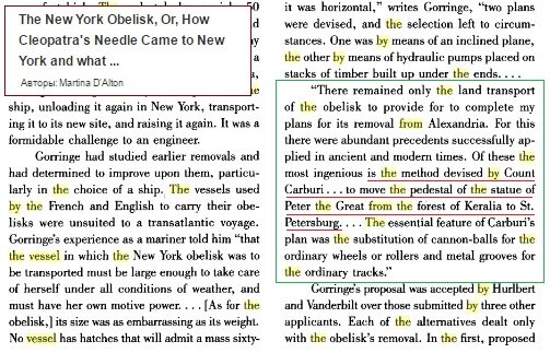 Или, как американцы перенимали у России передовой опыт. Всё-таки многому Россия смогла научить Запад. Так, опыт транспортировки гром-камня изучали механики всех развитых стран. Не избежали этого и США. Когда понадобилось перевезти из Египта обелиск , инженер, взявшийся решить эту задачу, изучил опыт перевозки гром-камня при помощи "саней на медных шарах". Это случилось в Америке в конце XIX столетия (то есть через сто десять лет). Читаем внимательно текст: (Название книги и автор указаны на картинке в рамочке наверху слева) Привожу перевод с английского выделенного мной места: "Оставалось обезпечить транспортировку обелиска по суше, чтобы завершить свои планы по его вывозу из Александрии. Для этого были многочисленные успешные прецеденты, применяемые в древние и современные времена.