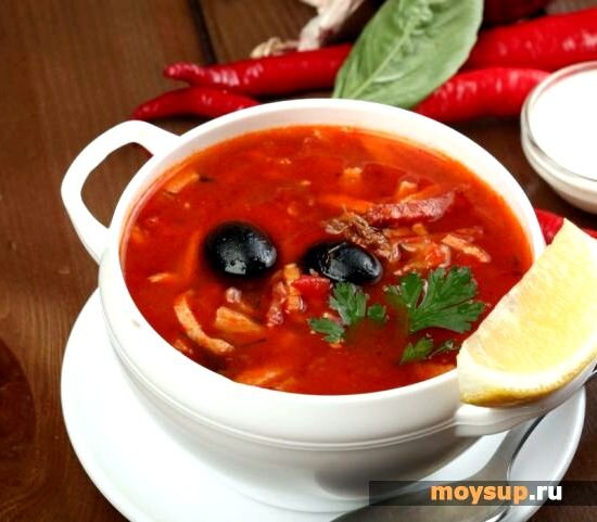 Самая вкусная сборная домашняя солянка. Классический рецепт с фото Сборная мясная солянка - классическое блюдо русской кухни. По сути, это наваристый мясной суп, который готовится из нескольких видов мяса с добавлением соленых огурцов, маслин, лимона и петрушки. Это неизменные ингредиенты классического рецепта. Многие добавляют в солянку морковь, картошку, квашеную капусту и т.п. У каждой семьи свои самые вкусные рецепты, которые совершенствуются с годами и передаются другим поколениям. Вот и рецепт настоящей солянки для каждого свой, как бы не спорили кулинары и ценители этого вкуснейшего мясного супа. Попробуйте приготовить сборную мясную солянку по классическому рецепту и определитесь, чего именно Вам в ней не хватает. Это и будет самый правильный рецепт солянки. Ну и самое главный секрет солянки - чем больше и разнообразнее мясное ассорти, тем и вкус у готового блюда будет насыщеннее. Необходимые продукты для классической солянки: Рецепт сборной солянки. 1. Свинину промываем и кла