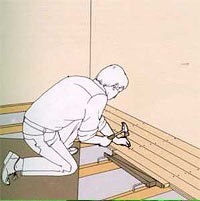 На рисунке показано, как доски из дерева мягких пород прибивают гвоздями непосредственно к лагам; доски из дерева твердых пород также можно укладывать непосредственно на лаги, однако узкие доски лучше укладывать на имеющийся дощатый пол, как показано ниже. В обоих случаях небольшие зазоры между досками и стенами, которые могут иметь некоторую кривизну или не быть прямоугольными, закрываются плинтусами. Однако если зазор получается слишком большим, придется отпилить последнюю доску под углом.