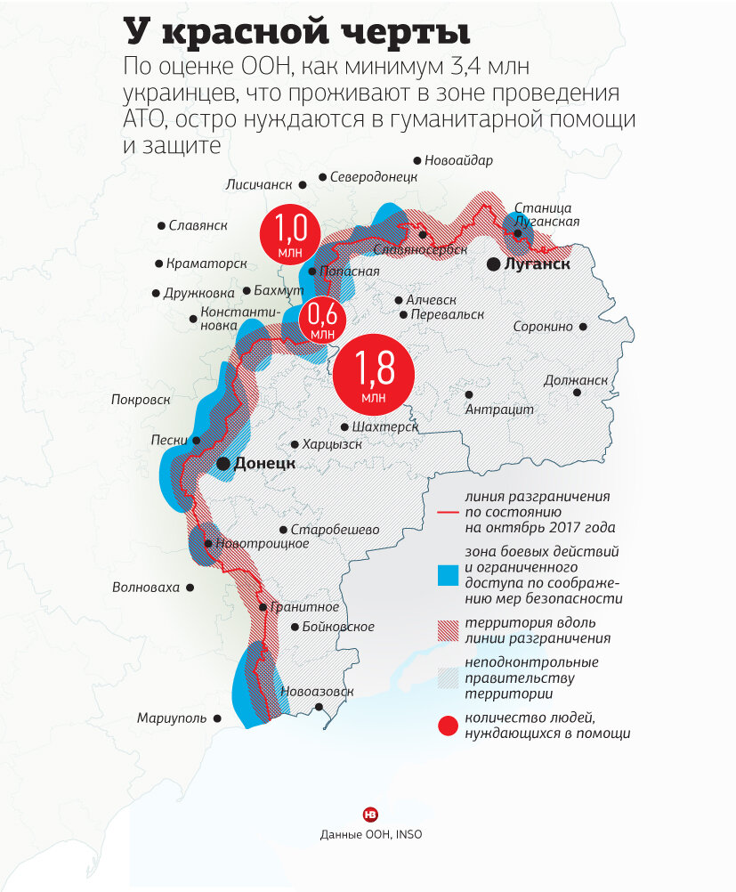 Всего в так называемой серой зоне на полосе размежевания, что протянулась на 457 км, проживает 600 тыс. человек. Из них около 100 тыс.— дети, 200 тыс.— люди поколения 60+. Некоторым из них приходится ежедневно пересекать линию огня. Кому — идти в школу, кому — на работу и обратно.