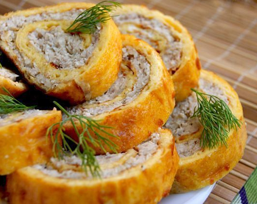 Это не просто куриный рулет, это наивкуснейший куриный рулет, очень сочный и аппетитный. Блюдо очень вкусное как в холодном, так и в горячем виде. Ингредиенты Основа 4 яйца 150 гр. твердого сыра 150 гр. майонеза 20 гр. манки Начинка 400 гр. фарша из курицы 1 луковица Соль и черный молотый перец по вкусу Приготовление Основа для рулета Взбиваем яйца с майонезом, добавляем манку и натертый сыр, оставляем для набухания манки. Пока займемся начинкой. Лук нарезаем мелко, обжариваем на растительном масле до золотистого цвета, затем перемалываем в блендере, добавляем соль и черный молотый перец, перемешиваем. На противень кладем пергаментную бумагу, смазываем растительным маслом и выливаем тесто, распределяем равномерно. Ставим в предварительно разогретую до 180 градусов духовку на 10-12 минут, до слегка золотистого цвета. Даем остыть, снимаем с бумаги, распределяем по всей поверхности фарш, сворачиваем в рулет, оборачиваем фольгой и снова отправляем в духовку на 40 минут. Даем руле