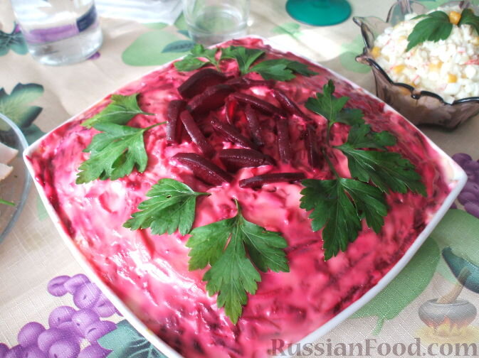 Продукты 2 селёдки 4 вареных яйца 1 луковица 1 средняя варёная свекла 4 варёные картофелины 2 варёные моркови майонез Как приготовить «Селёдку под шубой»: 1 слой: селёдка (филе режется мелкими кубиками). 2 слой: лук (мелкими кубиками). 3 слой: картофель (натирается на крупной тёрке). 4 слой: морковь (натирается на тёрке). 5 слой: яйца (натираются на тёрке). 6 слой: свекла (натирается на тёрке). Каждый слой смазывается майонезом. Салат «Селёдка под шубой»должен пропитаться. Приятного аппетита! Если вам понравился рецепт ставьте палец вверх и подписывайтесь на канал!