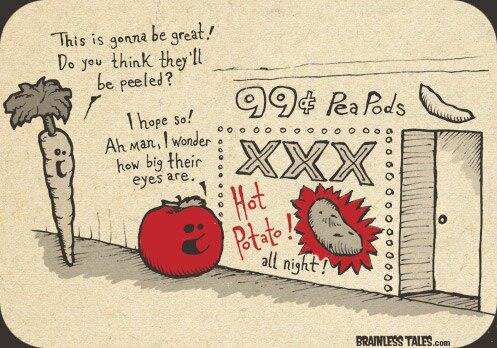 Объемный арт с множеством интересных словечек: Используются разные значения слов peeled, eyes и hot . Peeled – очищенный (овощ, фрукт) Peeled – голый Eyes – в данном случае не глаза, а “глазкИ” у картошки Hot – горячий Hot (сленг) - развратный Морковка: «Это должно быть круто. Как думаешь, они буду голыми?» Помидор: «Надеюсь! Чувак, представляю,какие у нее большие глазкИ» Надпись на входе: «Стручок гороха за 99 центов. Развратные картошки, всю ночь напролет» Ставь лайк и подписывайся на наш канал, впереди много всего интересного 😉