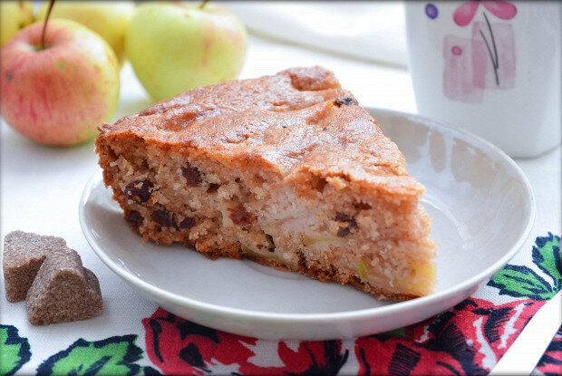 12. Изюм - ½ стакана Инструкция приготовления 1. Яблоки вымыть и нарезать тонкими дольками. 2. Смешать кефир, сахар, соль, ванильный сахар, корицу, масло, уксус и манку, хорошо перемешать. Соду добавить в муку и постепенно просеять к смеси, размешивая венчиком. Тесто должно быть, как густая сметана. 3. Добавить яблоки и изюм, перемешать. 4. Форму смазать маслом и посыпать манкой. Вылить тесто в форму и поставить в предварительно разогретую духовку. 5. Выпекать 40 мин при температуре 180 °С.
