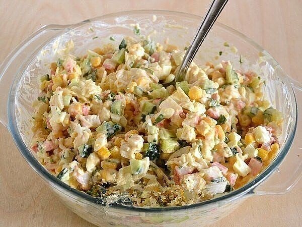 Ингредиенты: Крабовые палочки 500 г Яйца вареные 5 шт. Кукуруза 1 банка Огурцы свежие 200 г Майонез 180 г Соевый соус 10 г Чеснок 3 зубчика Петрушка свежая 1 пучок Все продукты по списку должны быть хорошо охлаждены перед приготовлением. Для заправки я использовала легкий майонез.