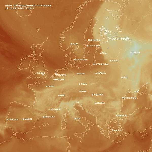 Анимация движения двуокиси углерода в атмосфере над Европой 29.10-05.11