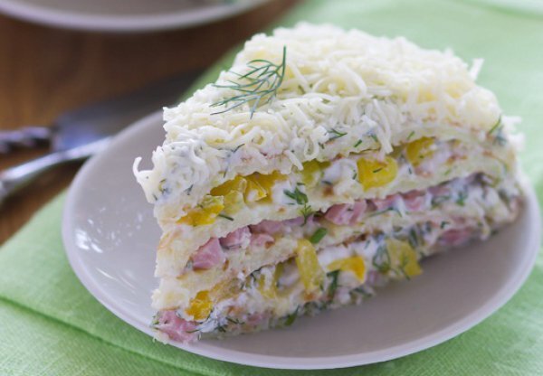 - Собрать торт, смазывая творожным кремом каждый кабачковый блинчик. Чередуя, добавлять нарезанный перец или ветчину. Верхний блин и бока торта смазать творожной начинкой и посыпать тертым сыром.