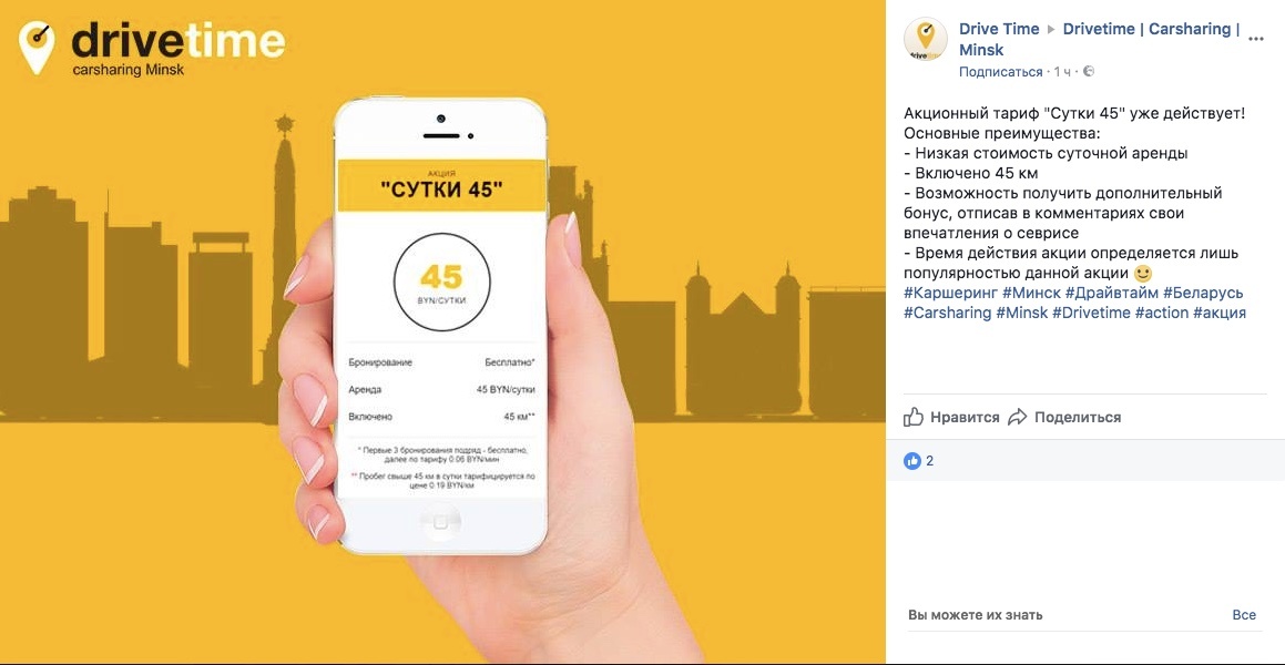 Минский оператор каршеринга DriveTime запустил акцию посуточной аренды «Сутки 45». Условия акции: Сроки проведения акции определяются ее популярностью. Чем популярнее акция, тем дольше она продлится. За оставленный комментарий о сервисе в группе DriveTime в Facebook можно получить дополнительный бонус. Читайте о транспорте будущего там, где удобно: Сайт Facebook Vkontakte Twitter Telegram Instagram