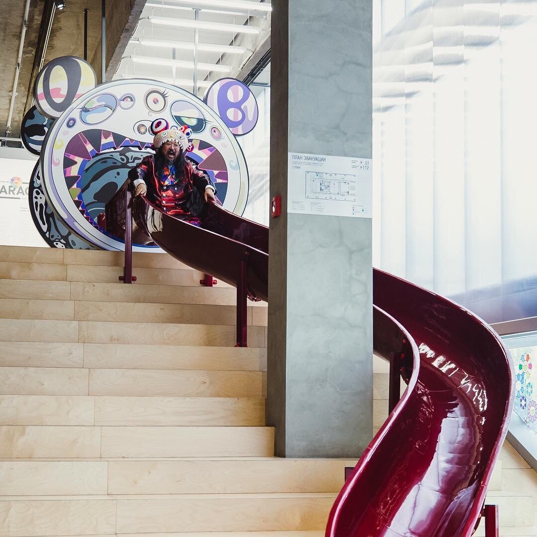 В московском музее современного искусства Garage сделали горку, спускающуюся с мезонина прямо к кафе. А протестировал ее Такаси Мураками — один из наиболее успешных современных японских художников. В музее открылась его выставка «Будет ласковый дождь».