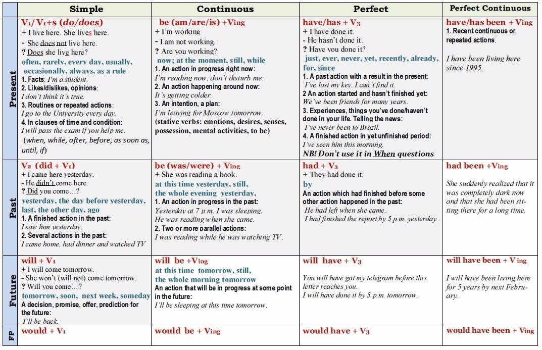 Ряды отвечают за то, к какому моменту времени относительно говорящего происходит событие (Past, Present, Future, Future in the Past). Столбцы отражают состояние действия.