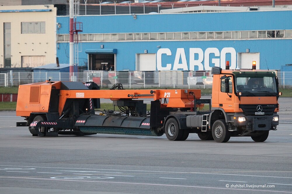На аэродроме работает множество техники, туда-сюда снуют самолеты, тележки с чемоданами, машины и тракторы. Все это хозяйство нужно содержать в образцовой чистоте, в двигатели самолета не должно попадать ничего лишнего. Но как убрать все эти перроны, рулежные дорожки, стоянки и взлетно-посадочные полосы? На помощь приходят специальные машины. В аэропорту Домодедово работает очень производительная техника. Вот эта машина Bucher за час может подмести 250000 квадратных метров, это 35 стандартных футбольных полей. Машина очищает аэродромное покрытие от снега и пыли. За один проход может очистить полосу шириной до 5 метров. Она работает при температуре до -25°С. Длина щетки 6 метров, она вращается со скоростью от 500 до 900 оборотов в минуту. Вот еще один достойны представитель спецтехники. Плужно-щеточно-продувочная машина Schmidt TJS 630. Она подметает и выдувает пыль или снег. Уборка может осуществляться на скорости до 50 километров в час. Когда нужно быстро очистить взлетно-посадочную п
