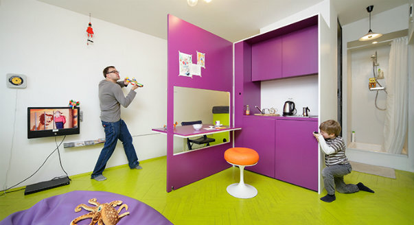 Когда разведенный папа проектирует квартиру для встречи с сыном, он, конечно же, хочет чтобы ребенку в ней понравилось. Но как сделать так, чтобы всем было весело и удобно, если все что у тебя есть – это 21,5 кв. метр? На первый взгляд, эта малогабаритная квартира вообще слабо пригодна для жилья – всего 21,5 метр. В лучшем случае здесь поместится кровать, санузел и какая-никакая кухня. А поиграть-побегать-пострелять? А ведь это-то и есть самое главное, если квартира строится как плацдарм для встречи разведенного мужчины с сыном. Мальчишке должно здесь очень и очень нравится. Архитектором квартиры стал Якуб Шченсны из варшавской компании Centrala, зарекомендовавший себя большим оригиналом. Якуб сделал из пространства площадью 21,5 кв. метра отличную наноквартирку для двух мальчишек: маленького и большого. «В первую я ориентировался на два окна, что для такого скромного метража – настоящая роскошь». У большого окна он сделал гостиную, вполне приличных размеров – 14 кв. м. К маленько