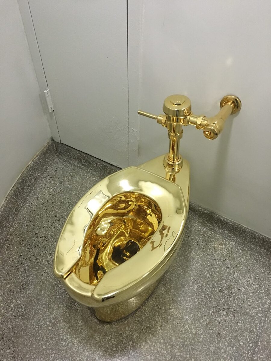 Этот функционирующий унитаз сделан из чистого золота. Воспользоваться им может любой посетитель музея Соломона Гуггенхайма в Нью-Йорке. Правда придется отстоять длинную очередь. Это художественный проект итальянского художника Маурицио Каттелана, чье творчество подчас носит провокационный характер. Инсталляция называется "Америка". Идея художника - обратить внимание на проблему экономического неравенства, дав людям возможность приобщиться к тому, что "доступно пресловутому одному проценту". Унитаз сделан из 18-ти каратного золота и полностью функционирует. Смотрители музея просят непременно им воспользоваться по назначению, ведь именно в этом и состоит художественный замысел автора.