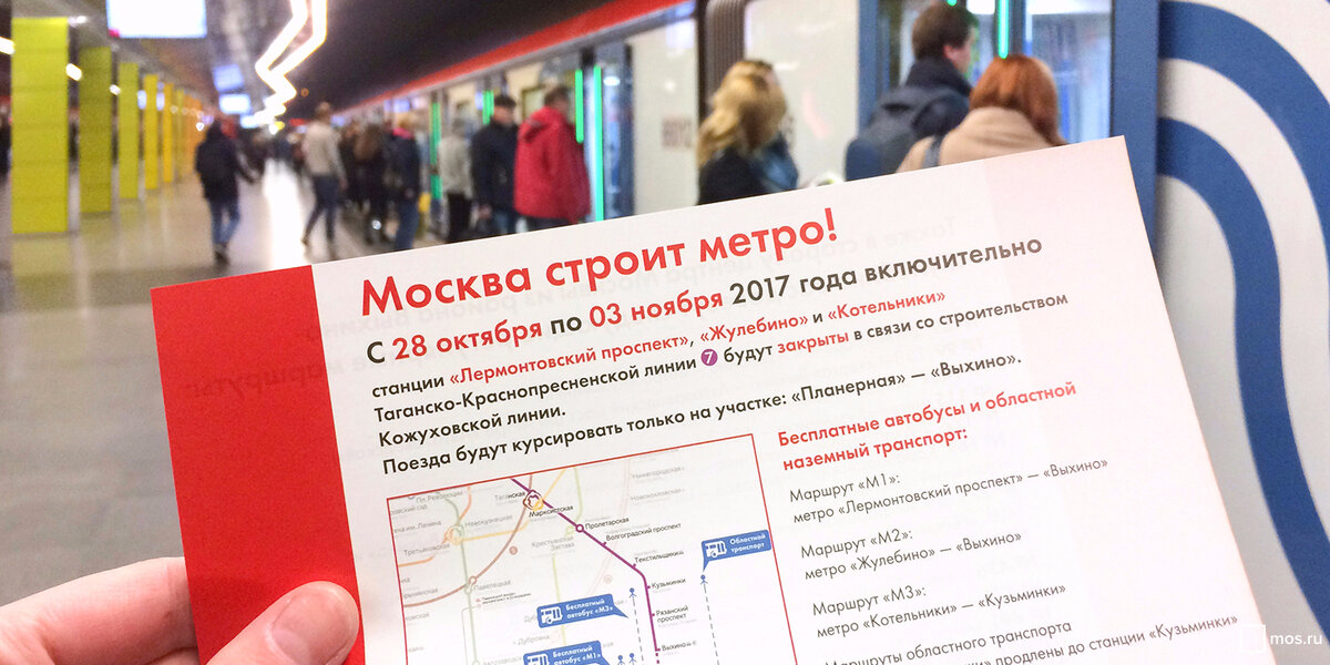 Москвичам и гостям города расскажут об альтернативных маршрутах. Сотрудники Центра обеспечения мобильности пассажиров метро раздадут листовки, рассказывающие о том, каким транспортом можно воспользоваться, когда закроется участок Таганско-Краснопресненской линии. С 28 октября по 3 ноября будут недоступны «Котельники», «Жулебино» и «Лермонтовский проспект». Москвичи и гости города получат 350 тысяч карт-схем метро и 300 тысяч листовок с альтернативными маршрутами и общей информацией (дополнительные 50 тысяч передадут на стойки «Живое общение»). В подземке также вывесят 600 информационных плакатов формата А1 с альтернативными маршрутами. Из них 250 разместят на стациях Таганско-Краснопресненской линии, еще 350 — на остальных станциях (по два плаката на каждой). Водителям об изменениях движения у закрытого участка расскажут инспекторы Московской административной дорожной инспекции и ГКУ «Администратор московского парковочного пространства». Они тоже раздадут соответствующие листовки — в р
