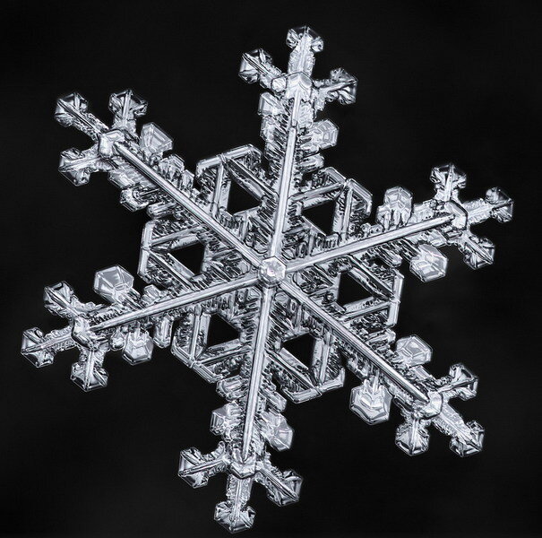 Симметричные крупные снежинки - это в природе редкость. Эта снежинка выделяется с точки зрения симметрии: редкий тип снежинки, которую нечасто встретишь. Симметрия в крупных снежинках - редкость, потому что, когда она растёт и начинает распространяться дальше от центра, скорее всего, вы обнаруживаете заметные перепады температуры и влажности от одного кончика до другого, в результате чего появляются изменения в характере роста отдельных лучей. Крупным планом: А здесь вы смотрите на тонкий лист льда, сфотографированный с перекрестной поляризацией света, чтобы вызвать яркие цвета, созданные структурой в самом льду. Невероятно красиво! Смотрите: Эта снежинка напоминает знак немецких военно-воздушных сил, которые современные Люфтваффе используют в качестве разновидности Железного Креста . Эта снежинка очень похожа на этот символ, и она именно такая... уже сотни лет. Это необычайно идеальный пример снежинки типа “пулеобразной розетки”. В самом центре верхняя и нижняя “пул