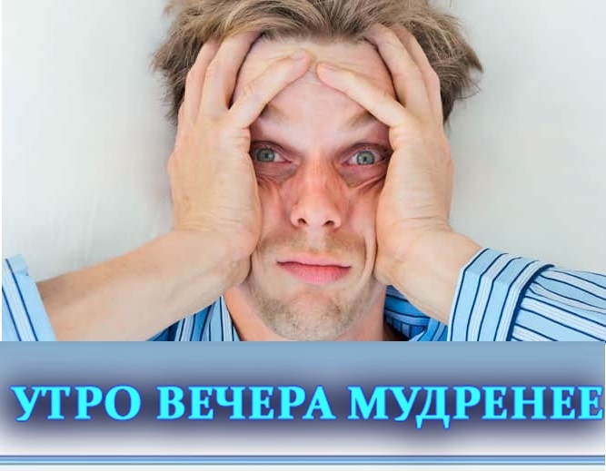 Утро вечера мудренее... Толковые словари единодушны: МУДРЁНЫЙ – непонятный, причудливый, странный. И почему утро не мудрее? Как то попались строки; «Утро вечера мудренее, Непонятливей и слабее. Я не выспался. Я болею. Утро вечера мудренее…» Не хочу показаться некорректным, но в некоторых словарях «Мудрёный» - сосед «Мудака». Вывод: «Ты не Менделеев, дай башке поспать, и утро будет добрым! �^]B�